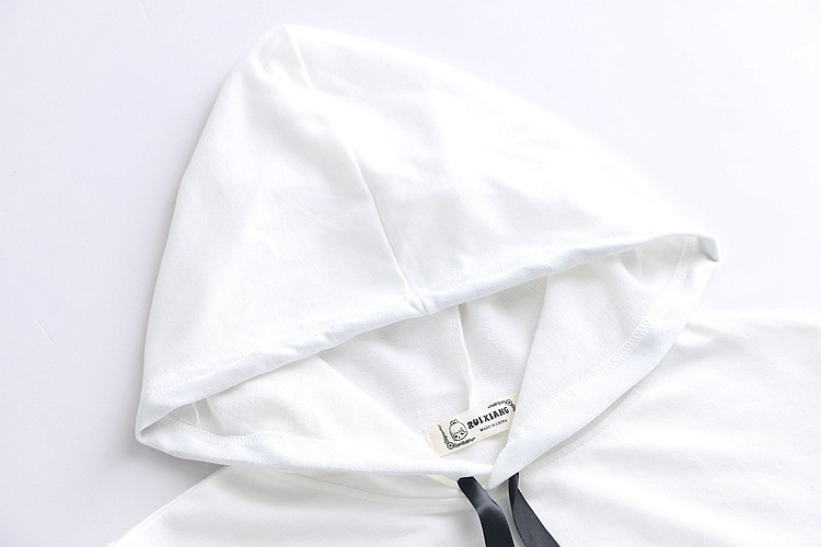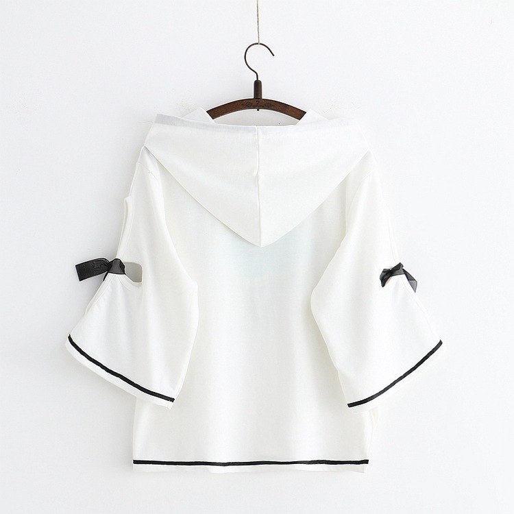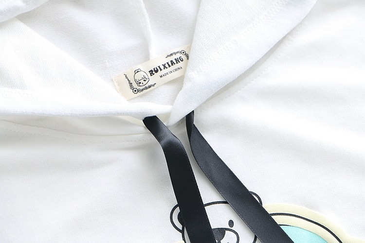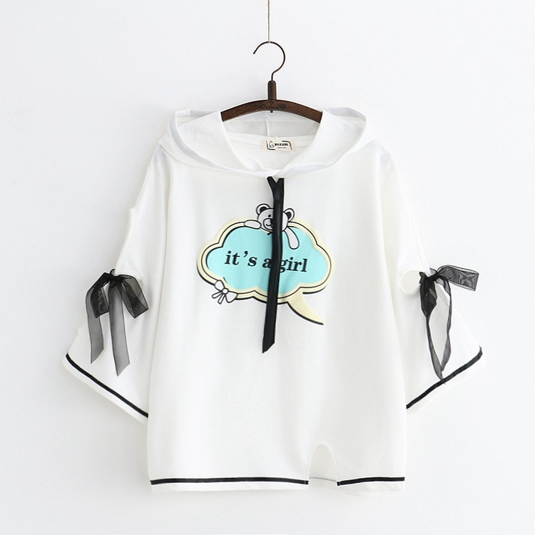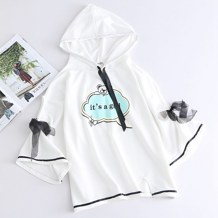 女裝-襯衫春夏少女小熊印花系帶五分袖上衣連帽短袖衫純棉T恤套頭衫S6915